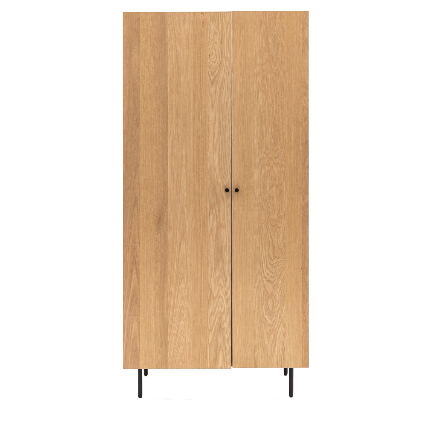 Add a contemporary look to a bedroom with this lovely wardrobe. It is crafted using oak veneers paired with a black metal underframe and door handles. The natural wood veneer, with its unique random knots, has been selected to give a modern rustic style. Matching pieces available.