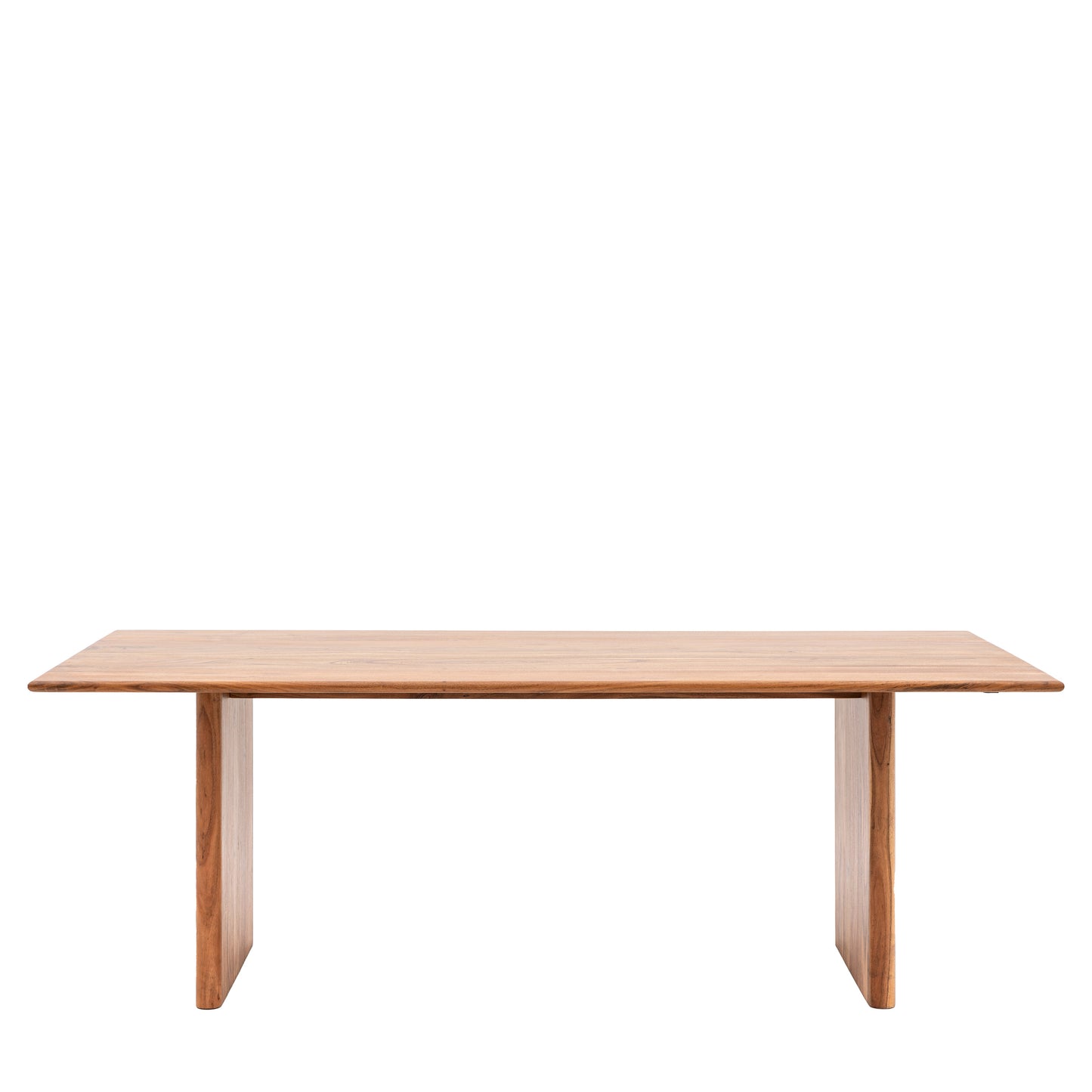 Stunning contemporary design dining table. Crafted from solid acacia wood with a warm natural finish which shows off the beautiful grain of the timber, the table offers a sturdy yet elegant look. The solid legs have soft curved ends and the tops have rounded edges to echo this. The table is available in a larger size and there are also two sizes of dining bench.