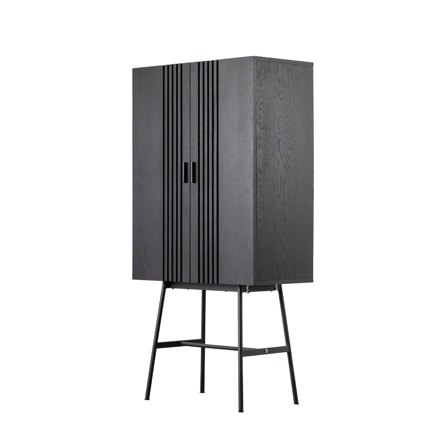 This stunning drinks cabinet offers a striking contemporary look, with the slatted design on the doors adding interest. Crafted using solid oak for the slats and oak veneers, the matt black finish beautifully shows the grain of the wood and pairs perfectly with the matt black metal legs. Matt black solid oak handles add the finishing touch. Internally, each cupboard has two adjustable shelves for added practicality. The cabinet is part of a collection which offers a selection of cabinets.\n\nThe collection is part of our Packed-Flat Design Project, offering easy delivery to any room in any property, whilst reducing the packaging needed. Easy assembly is required, but all the tools needed are supplied.