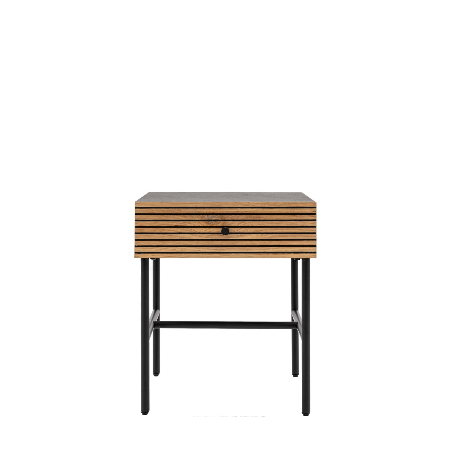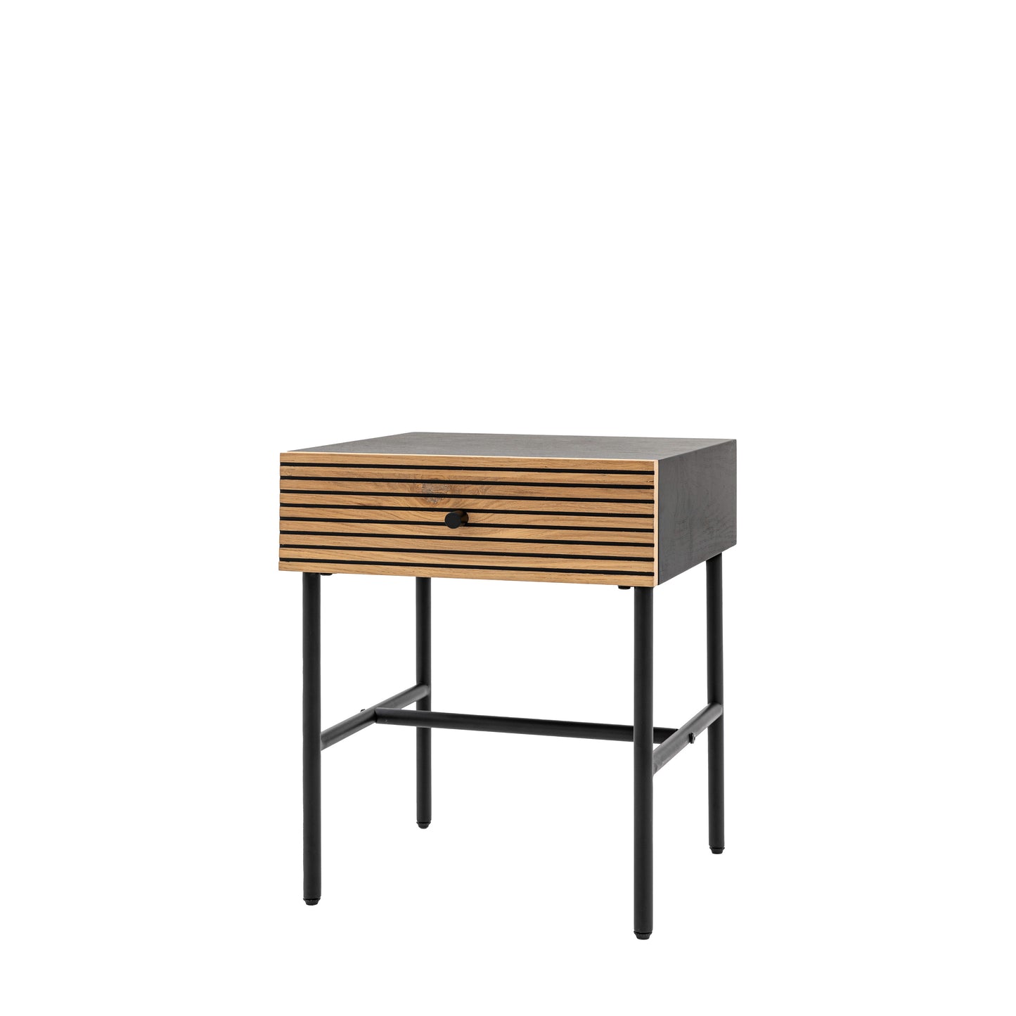 Add a contemporary look to a room with this stylish bedside. The carcase has a black finish with a pressed woodgrain effect to create a premium look. The drawer fascia is real oak woodgrain veneer with a feature black line pattern. A black metal underframe and drawer handle complete the look. Matching items available.