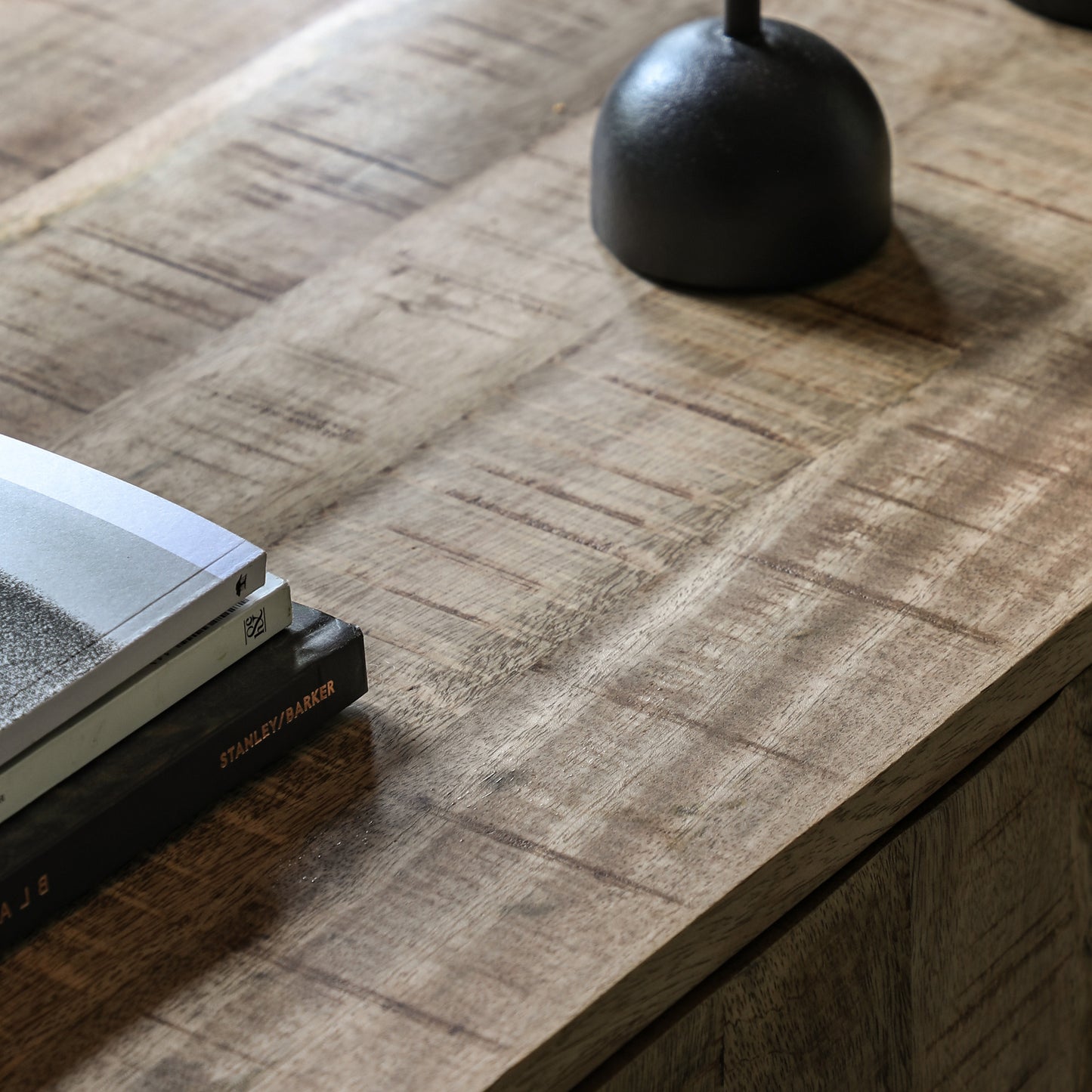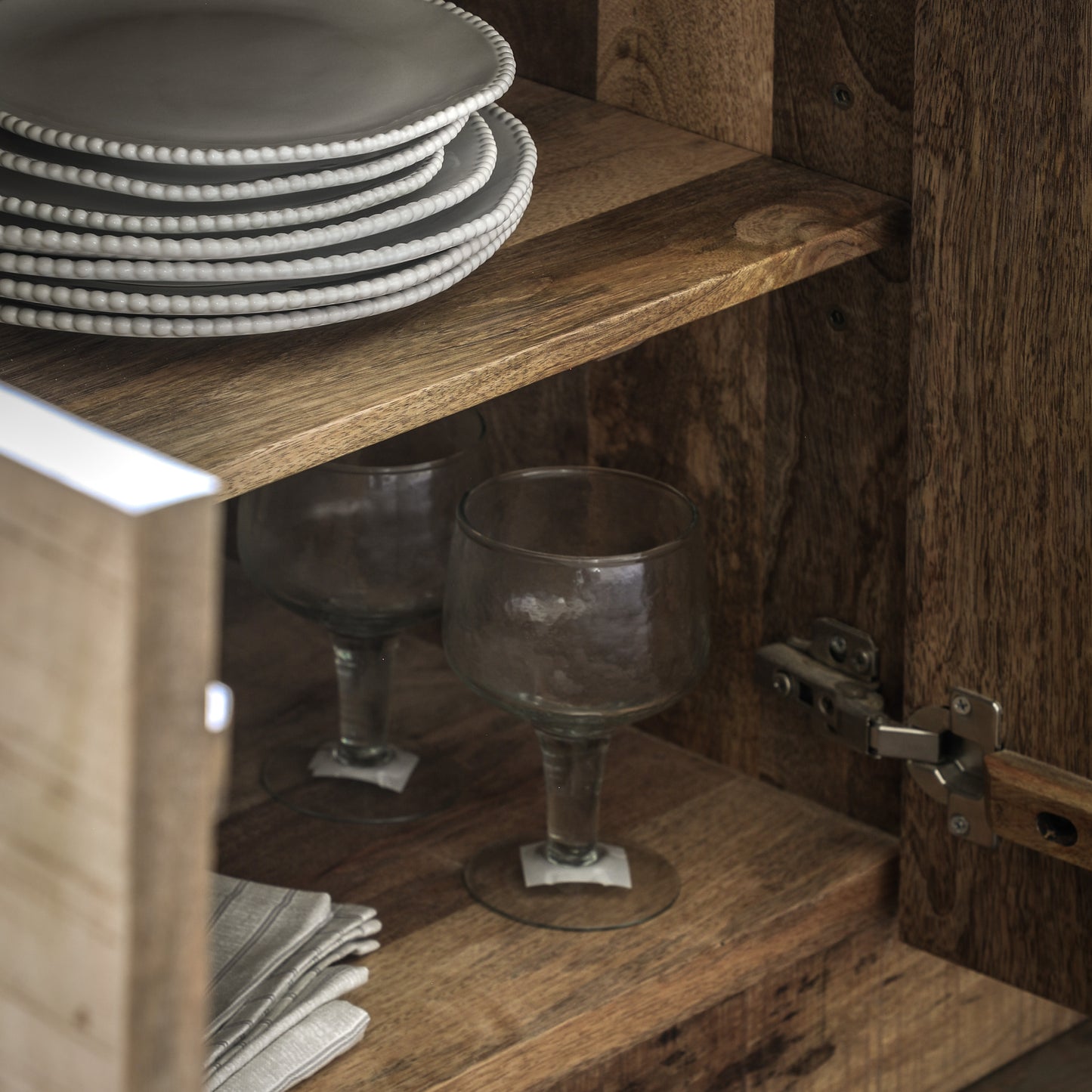 Add rustic charm to your home with this sturdy sideboard. With rough hewn Mango wood in a charming natural finish, this chunky sideboard features 4 doors with 2 cupboards and interior shelves, perfect for storage. Also available in a whitwash finish. Coordinating additional pieces available.
