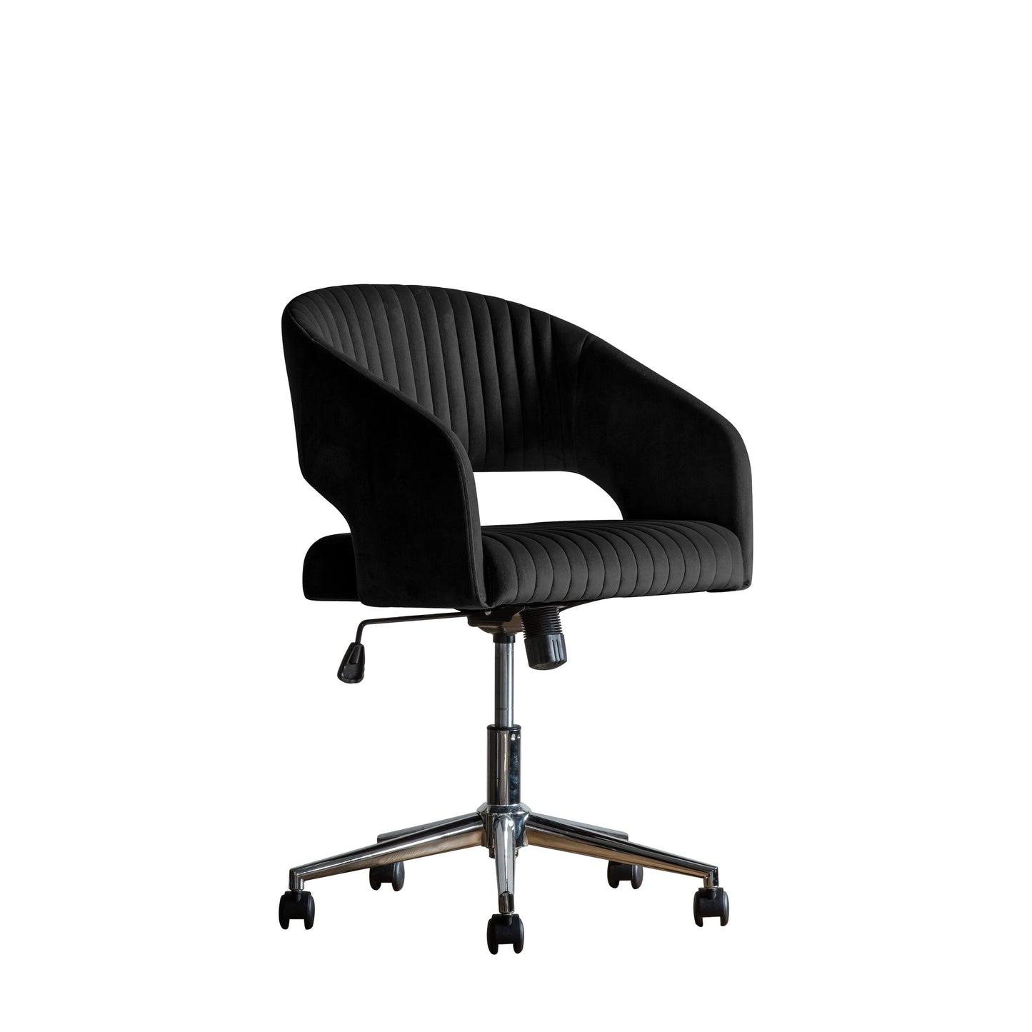 Add a touch of glamour to a home office with this sophisticated swivel chair. Upholstered in tactile black velvet which pairs beautifully with the silver base, the chair offers style, comfort and practicality. The padded back and seat feature stitch detailing, whilst castors give easy manoeuvrability, plus there is tilt adjustment and gas lift seat height adjustment. Also available in four other colours.