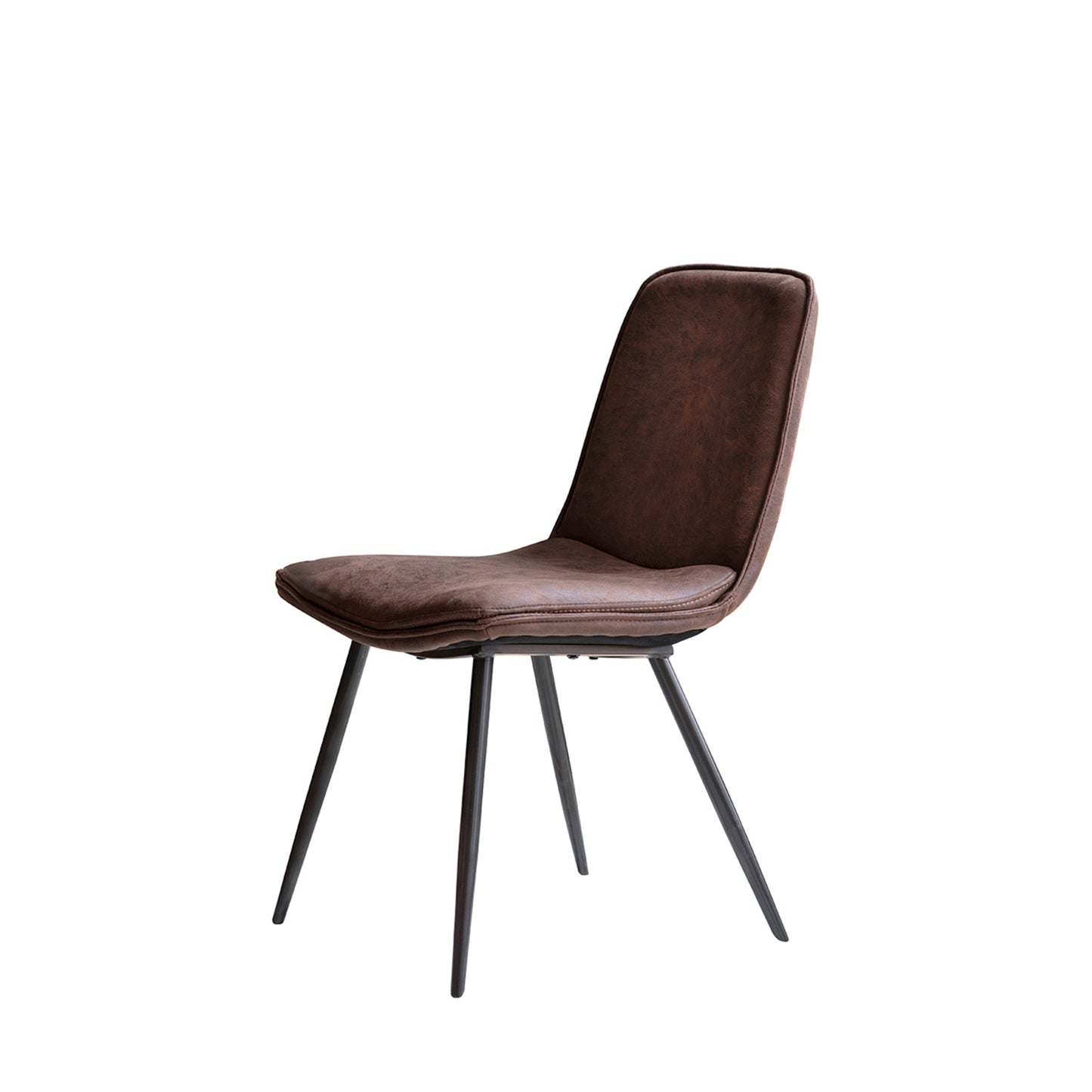 Contemporary dining chair upholstered in a faux leather with modern metal legs.