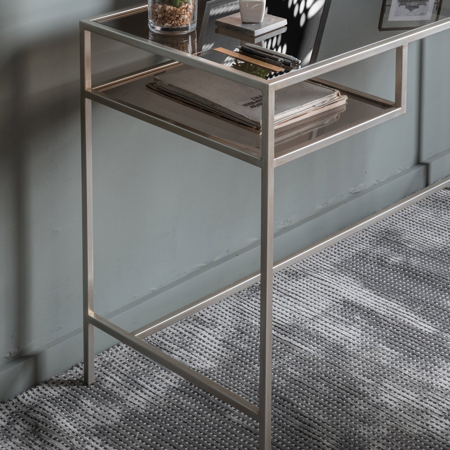 A sleek, engineered desk featuring a slender metal frame, in a stylish silver finish, which pairs beautifully with the brown smoked glass. Perfect for adding a touch of glamour to a home office, the sophisticated design features two open storage shelves. It is also available in a bronze finish.