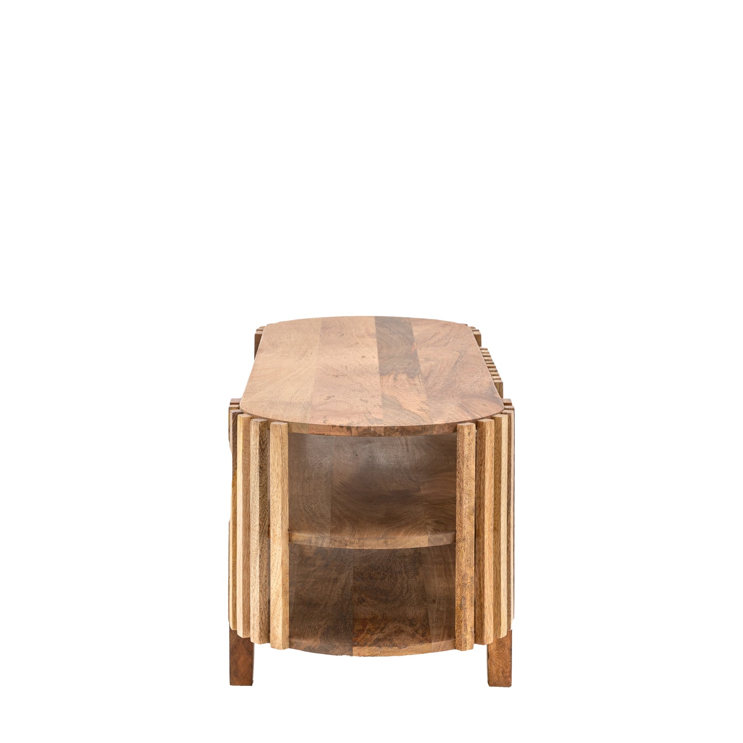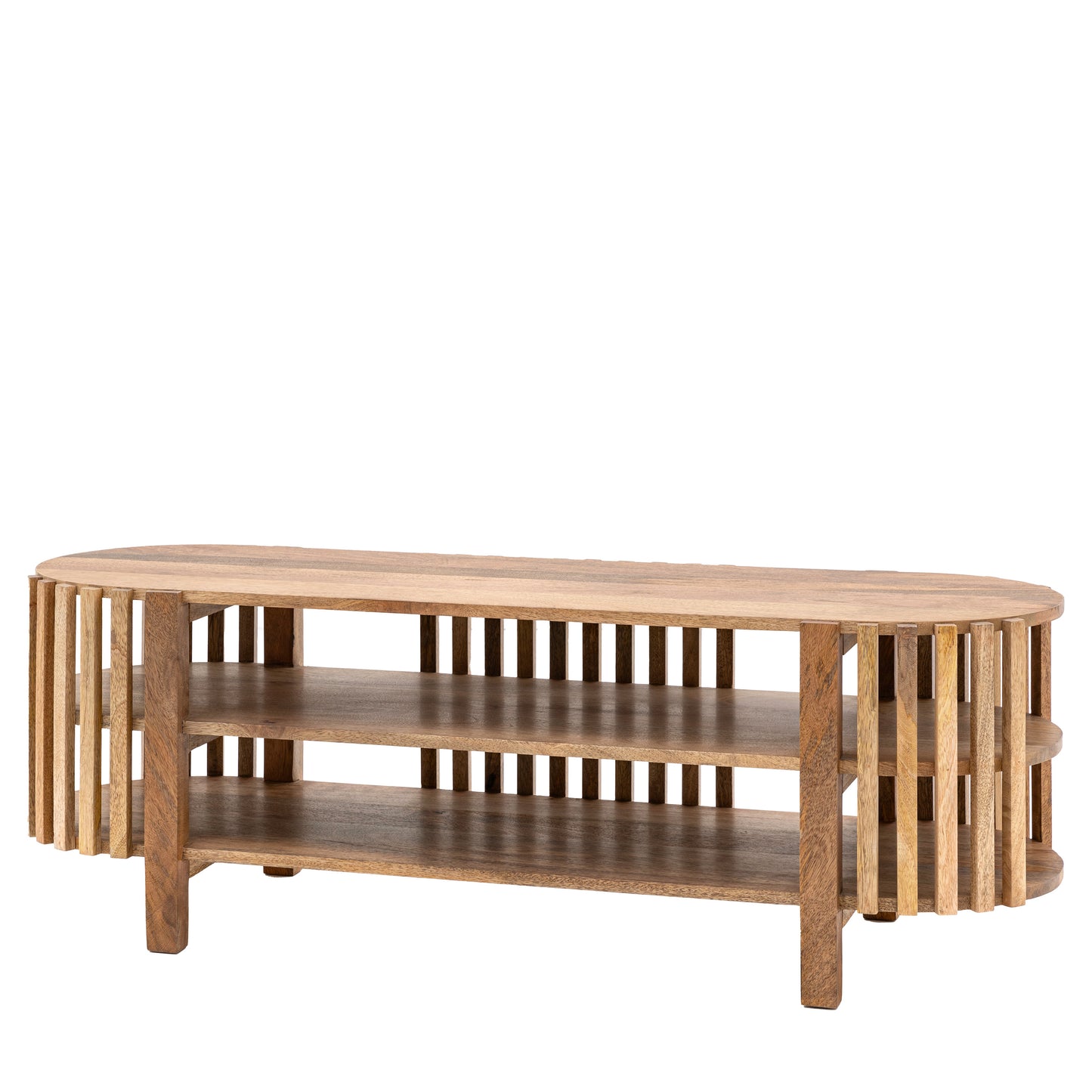 With plenty of storage for all of your electronics, this eye catching media unit is the perfect balance of practicality and style. The oblong unit features an unusual vertical slatted design and 3 shelves, so you'll never be short of space. Made from Mango wood in a natural finish that shows off the rich deep grain of the wood. Coordinating items also available.